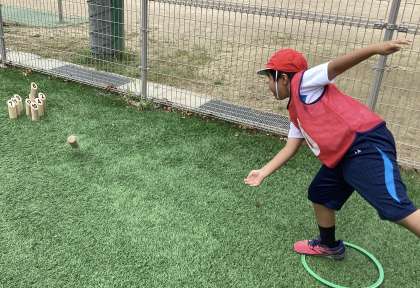 投げる木製の棒のことを「モルック」といいます。下手投げで行うのが基本で、木製のピン(スキットル)を倒します。