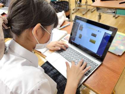 社会では平氏と源氏についてGIGA端末を用いて、調べています。歴史の中で政治などが大きく動いた時期であるので、生徒たちもワクワクしながら学習を進めていました。牛若丸や武蔵坊弁慶などアニメや漫画でも聞いたことがあるような名前も出てきたので「あ〜知ってる」という声も聞こえました。知っている人物の名前が出てくると歴史はグッと面白くなりますよね。