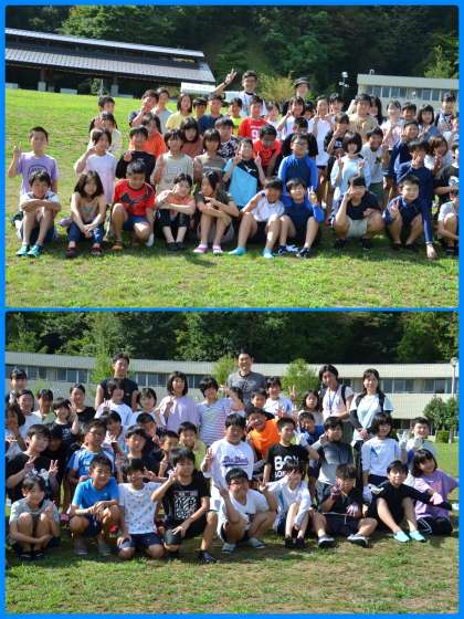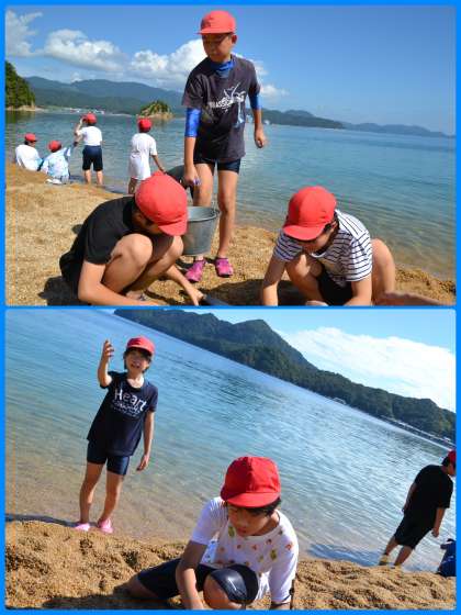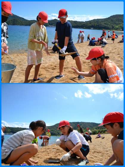 午前中の磯観察と砂の造形の活動の前に学年写真を撮りました。まずは砂の造形の様子から。