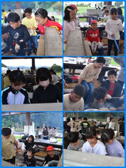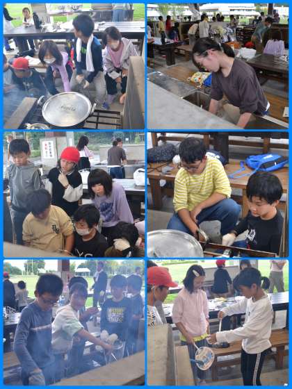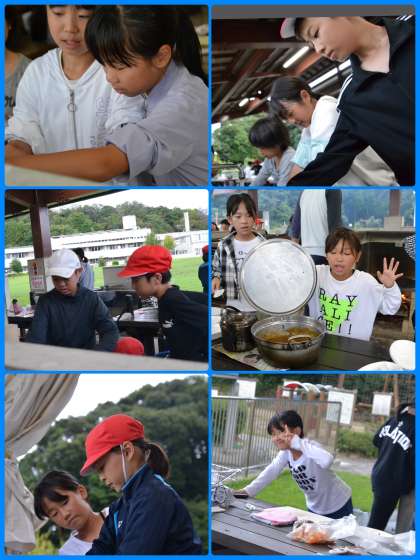 野外炊事の様子です。もちろんメニューはカレーライスです。ご飯がうまく炊けるか心配です。昨年は花背でもカレーを作りましたが、その時は8年生がお手伝いをしてくれていました。今回は自分たちだけで火おこしからの挑戦です。