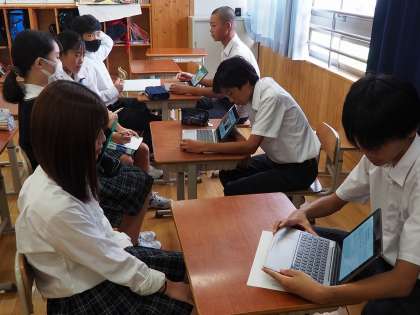 8年生が夏休みに行った高校調べの成果を聞かせてもらいました。