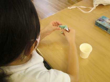 咀しゃくチェックガムを使用して、どのくらい自分の噛む力があるのかなと確認しました。
