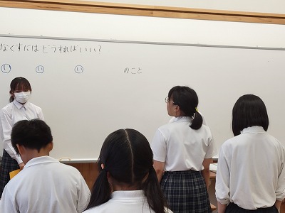 これらを防ぐためにはどのようなことが大切なのか、今回は代表委員の生徒が先生となり、考えていきました。