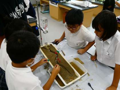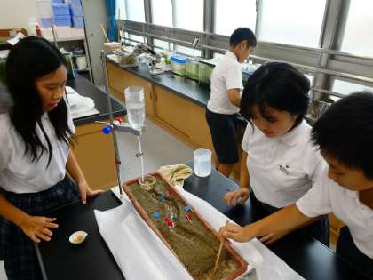理科の学習は、ミニ川を作って流水実験を行いました。