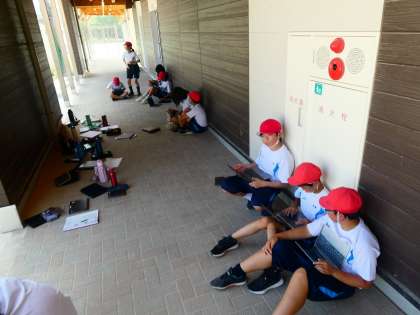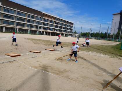 走り幅跳びの学習では、「助走」「踏み切り」「空中動作」の3つに分けてポイントを整理して学習を進めています。記録を伸ばすために、一生懸命取り組んでいます。