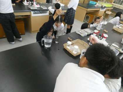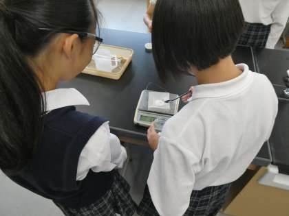 メスシリンダーや、電子測りを使って薬品を正確に測ることができるように何度も繰り返し学習をしました。これからの学習では薬品をたくさん使っていきくので、今日の学習をしっかりと身につけておいてほしいと思います。