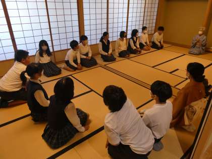 清蓮の間では、お茶の作法を学びました。真剣なまなざしで話を聞いたり、見たりしていました。