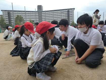 ピア清掃活動を5時間目に行いました。1年生とペアを組んで自己紹介をした後、掃除に向かいました。学校の周辺やさんさん公園を清掃し、たくさんのゴミを拾っていました。