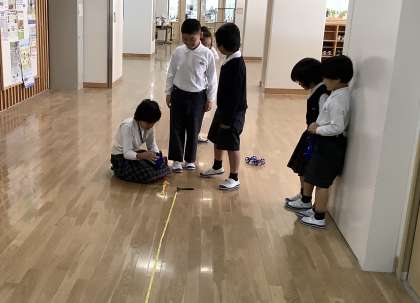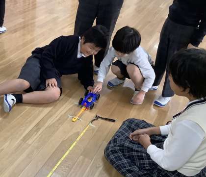 ゴムの力で動く車を使って「ふつうのゴム」「ふといゴム」「たばねたゴム」のうち、どのゴムが一番遠くまで車を走らせることができるのか予想をたてて実験しました。