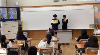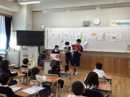 国語Cチームの生徒が1年生に絵本の読み聞かせをしました。
