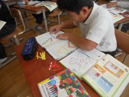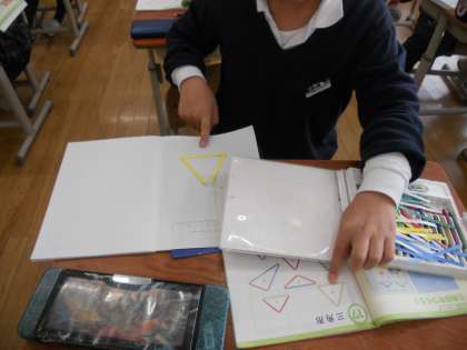具体物を使いながら、正三角形や二等辺三角形を作り、