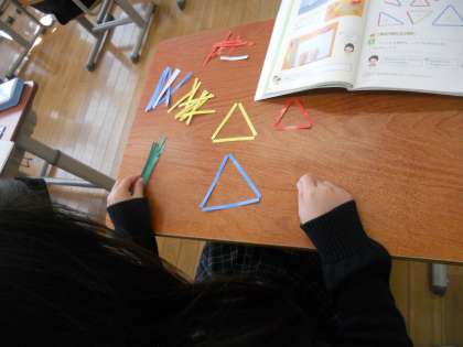 この写真は、3種類の長さの棒を使って、色んな三角形を作りました。