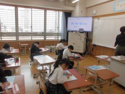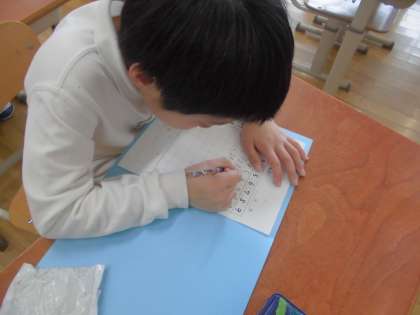 3学期も九九を覚え、早く計算できるよう、チャレンジタイムで九九の百マス計算に挑戦しています。九九の段の順番に並んでいる問題から、数字がバラバラに並ぶ問題まで色々な計算にチャレンジしています。