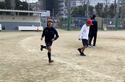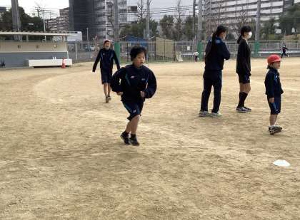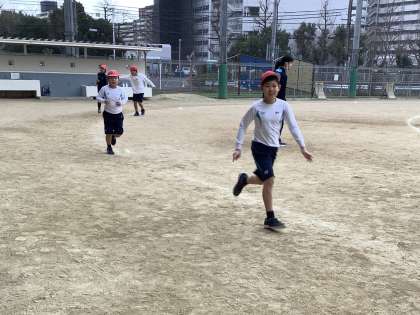 体育では1〜9年生が一緒に学習しています。上級生とペアになって「あと〇周だよ!」「ラスト1周!」と、声をかけ合い励まし合いながらがんばっています。