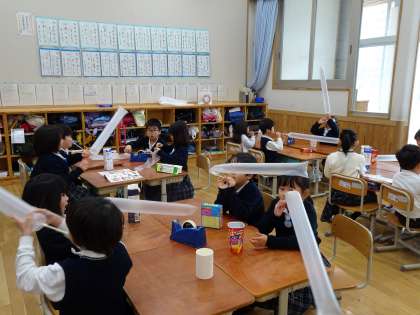 図画工作の学習で、袋をふくらませるしくみをつくりました。