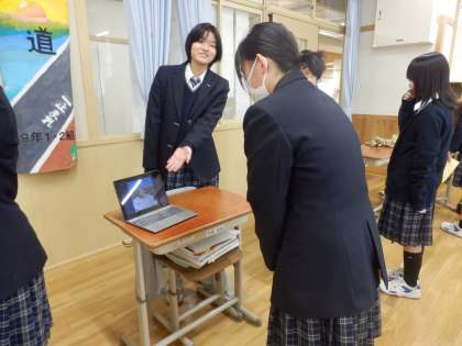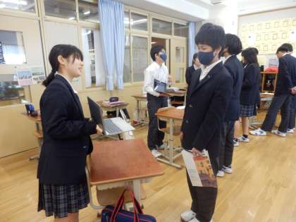8,9年生が英語の授業内に交流をしました。9年生が作成した尊敬する人物についてのプレゼンテーションを8年生が聞き,コメントをしました。9年生はスライドを使って8年生に質問しながら発表していて,8年生はプレゼンの内容を理解をしていたようです。8年生とって1年後のモデルとして,参考になる工夫がたくさんありましたね。9年生にとっても,とても良い発表の機会となりました。