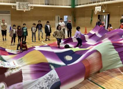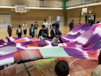 「ふろしきバルーン」でいろいろなかたちを作ったり、波の上を走ったりして遊びました。