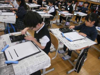 そのクラスもとても姿勢がよく、集中して磨っていました。5分おきにどれくらい黒くなたのか試すことを1回目に行いました。
