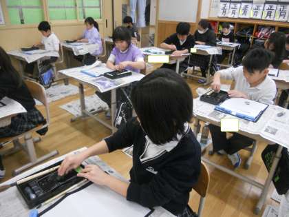 初めて、墨を磨る体験をしました。欠席をしたらいつもは休み時間や放課後に書いているのですが、今回は墨をするのにかなり時間がかかるので、その時間のみとしました。ただ、欠席者にももう一回チャンスをあげ、なるべくみんなが体験できるように2週にわたって2回設定をしました。