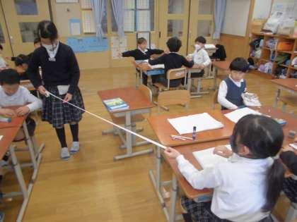 1mを作った後には教室の中から1mに近いものをさがしました!