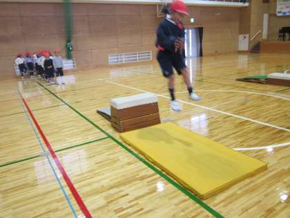 準備と片付けの練習の後は,片足で踏み切って跳んだり,両足で踏み切って跳んだりと,いろいろな跳び方に挑戦しました。