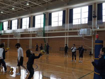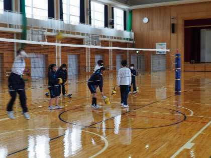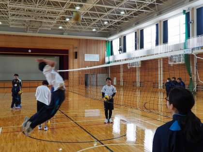 体育ではバレーボールのスパイク練習をしていました。