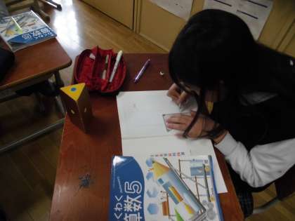 模型を観察しながら、展開図を書いている様子です。