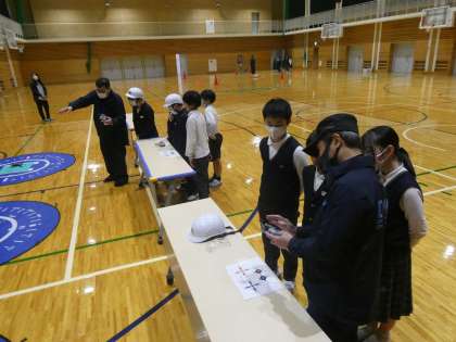 社会科の学習で、株式会社シントム 京都ドローンベースの方に来て頂き、ドローン体験、デモンストレーション、動画視聴を行いました。