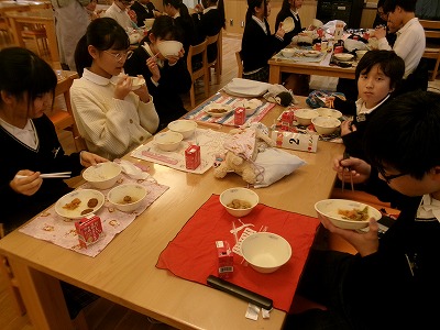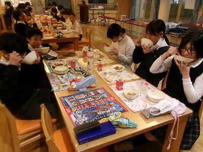 「ランチルームで食べる給食は一味違うな」と6年3組H先生が言うと、生徒たちは首を大きく縦に振った。