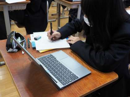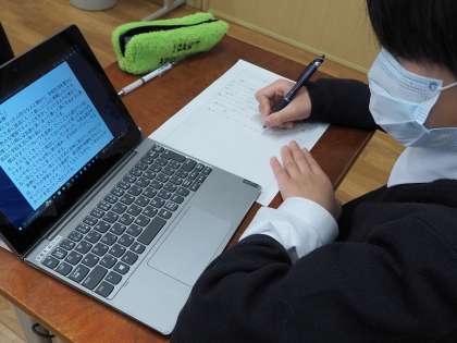 ボールペンでの清書中、失敗してもめげずに再チャレンジする