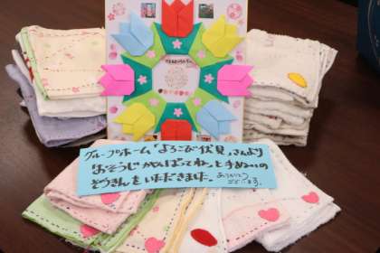 校区内のグループホーム「よろこび伏見」の皆様より、手縫いのかわいらしい雑巾をいただきました。「お掃除、がんばってね」のメッセージ付き色紙は、昇降口掲示板に飾っています。アップリケのついたかわいい雑巾は、低学年の子供たちに使ってもらおうと思っております。ありがとうございました。地域の皆様の温かいご支援に支えられております。