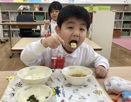 学校でのはじめの給食、1年生にとっては「楽しみ」と「不安」の両方の気もちがあったのではないでしょうか。いざ給食がはじまってみると「いただきます!」と元気よくあいさつをして「おいしい!」と言って食べていました。