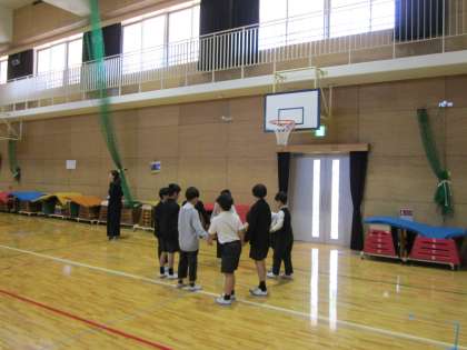 学年集会でフラフープを使用してみんなで協力して遊びました。