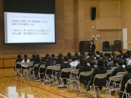 6年生も自分たちの学年目標「NEXT〜想いをつなぐ〜」について紹介をしました。
