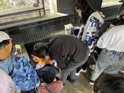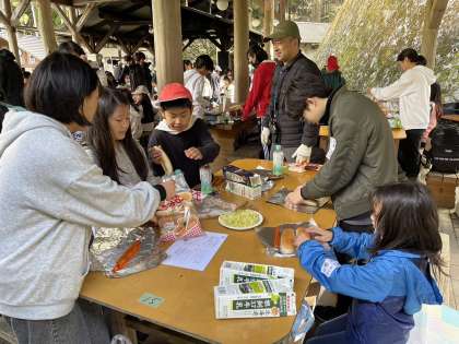 朝食は野外炊事場でのパックドッグです。ここでも4年生と8年生が協力して、パックドッグをつくっています。2日目は4年生がリーダー。8年生もやさしく見守ってくれています!