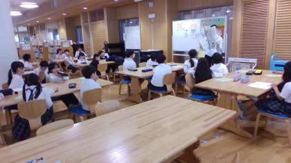 先日、図書館オリエンテーションがありました。図書室の利用の仕方や読みたい本の探し方を学校司書の先生から教えてもらいました。早く本を借りたいと言っていた生徒も多かったので、みんな何の本を借りようかとわくわくした表情で本を選んでいました。