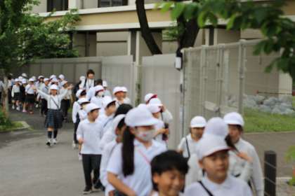 昨晩から続いた雨も2時間目には上がり、3時間目から、2回目の町たんけんに出発しました。身近なさんさん公園から、種智院大学の方面に向かって歩きました。