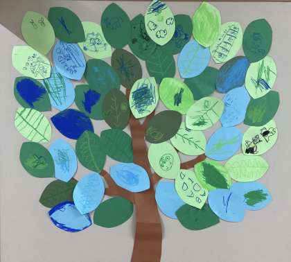 5月に入ったので、桜から青葉にかわりました。子どもたちが葉っぱに模様や絵をかきました。ご来校の際にはぜひご覧ください。