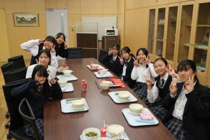 先日、ランチタイムにリモートでの表彰式を行い、その後、女子ソフトテニス部9年生と校長室で一緒に給食をいただきました。