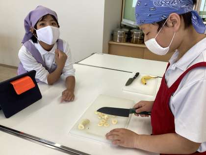 輪切り、半月切り、いちょう切りの学習をしました。