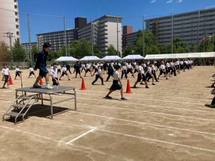 けがせず乗り切るための重要なアップ!秀蓮体操を体育委員長がリードしてくれました。体育委員も前でお見本としてやってくれています。