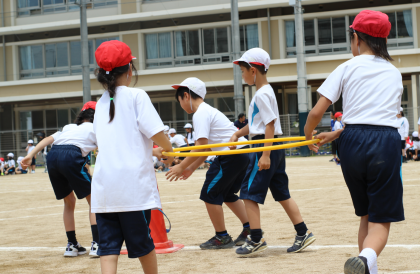 1年生から4年生が参加するステージ種目「つないでくぐって」。
