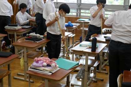 7年生独自の取り組みとして、普段清掃のない月・水・金曜日の終学活前に5分間清掃(汚れていると思う所や,ロッカーや机の整理整頓など自分で必要な清掃場所を探して行う)をしています。これは生活環境委員会からの提案で、掃除の機会が少ないという点や、日々きれいな環境を整えて快適に過ごしたいという思いから始まっています。これからも主体的に動く姿を期待しています。