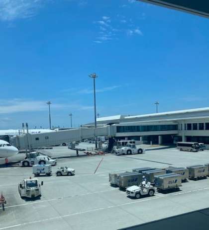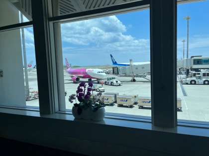 飛行機は、12時過ぎに無事那覇空港に着陸しました。きれいな青空が広がっています。