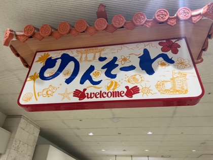 空港で「めんそーれ沖縄」の看板にお出迎えを受け、これから平和学習の場所へバスにて移動を開始します。