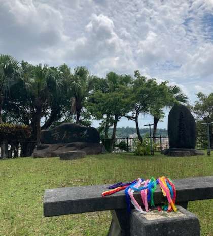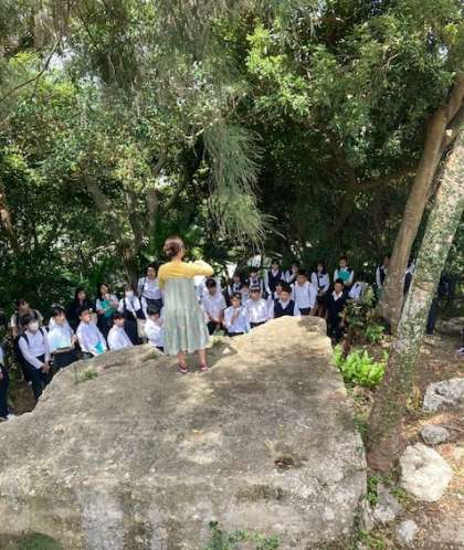 嘉数の高台に到着しました。琉球大学の学生の方から説明を受けながら、平和学習をします。
