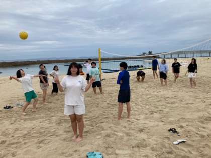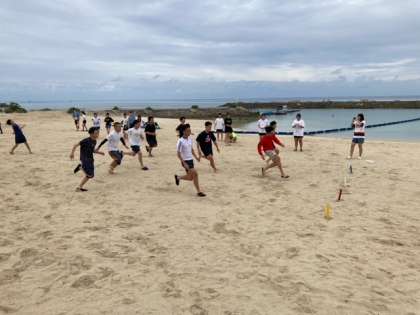 沖縄の空の下、ビーチバレーとビーチフラッグを楽しんでいます。