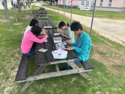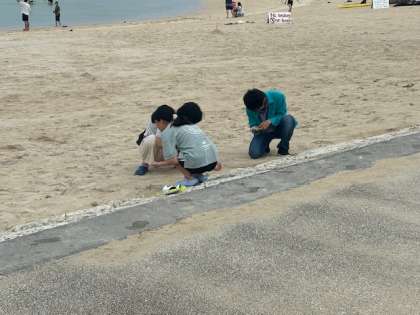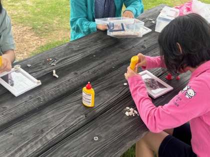 クラフト体験もできます。貝殻・砂・ビーズなどで写真たてを制作。砂浜で、貝殻を集めたり、ボンドの上に砂をかけたりしています。