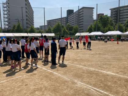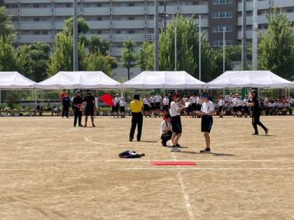 ステージ種目「キャプテンリレー(パーテーションリレー)」を行いました!ステージ実施の時よりも上手くなっており,最後の最後まで白熱した勝負になりました!