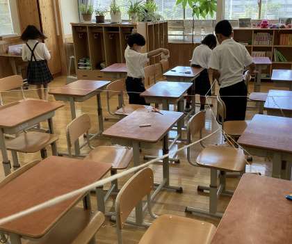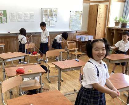 今日は教室を「ひもひもランド」にしよう!ということで、教室中にひもをはりめぐらせました!